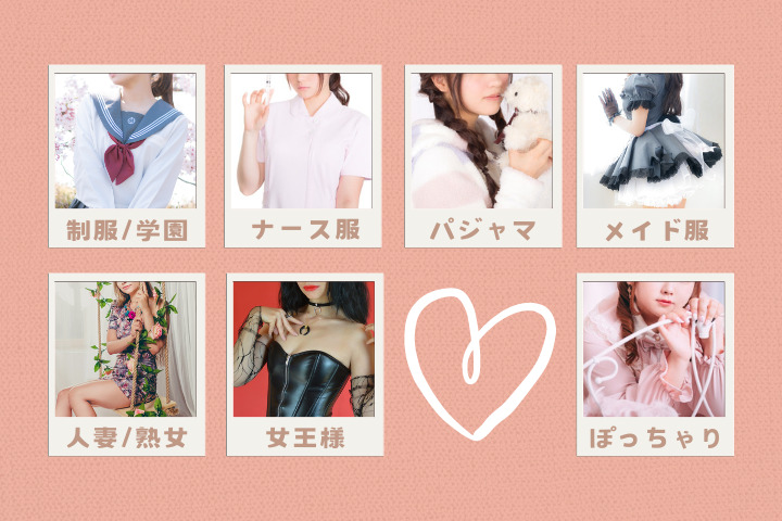 JK、OL、ナースなどの制服系、アニメ系など、さまざまなコスプレの女の子をコンセプトししているお店や、コスプレの中でもどれか1つに特化したお店などさまざま。
