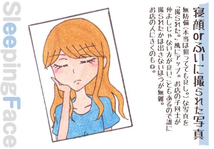 職業病な気もしますが、キメ顔で写真に写ることは一旦忘れて…(笑)ふいに撮られたような自然な写真を所々に忍び込ませるのも◎です!お店の女の子同士が仲良しじゃない方が良いというところもあるので「〇〇ちゃんに撮ってもらった」などは出さなくてOK!その辺りもお店のスタッフさんに確認しておくと良いですね。