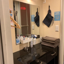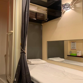 個室内にはシャワー室とベッドの設備があります。
