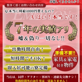 - ノルマ/罰金なし 自由出勤OK 生理中勤務可 託児所紹介あり 寮あり 送迎あり アリバイ対策あり 制服/衣装貸与 裸なし