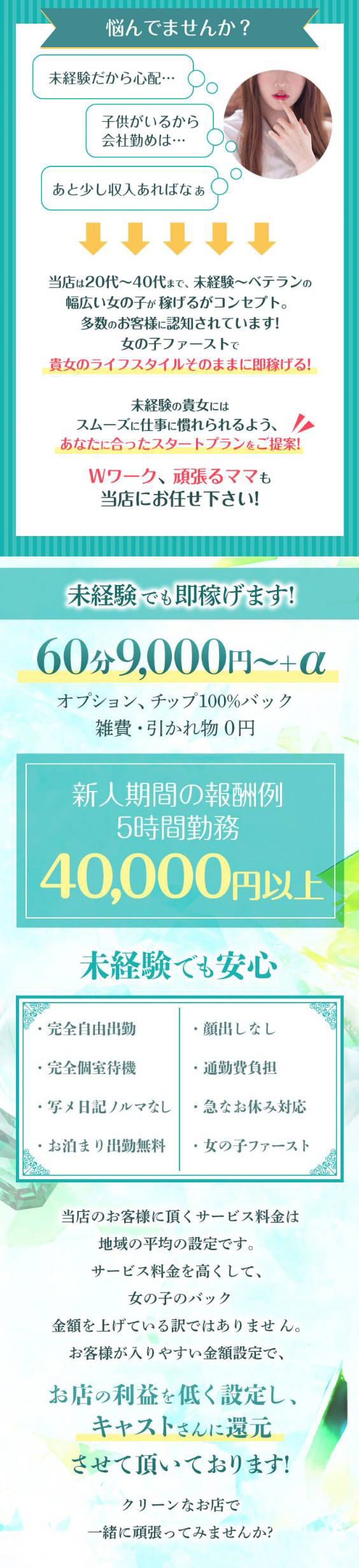 当店では新規のお客様、リピートのお客様にも利用してもらいやすく、女の子が安定した高収入を見込めるよう料金の設定をしております。