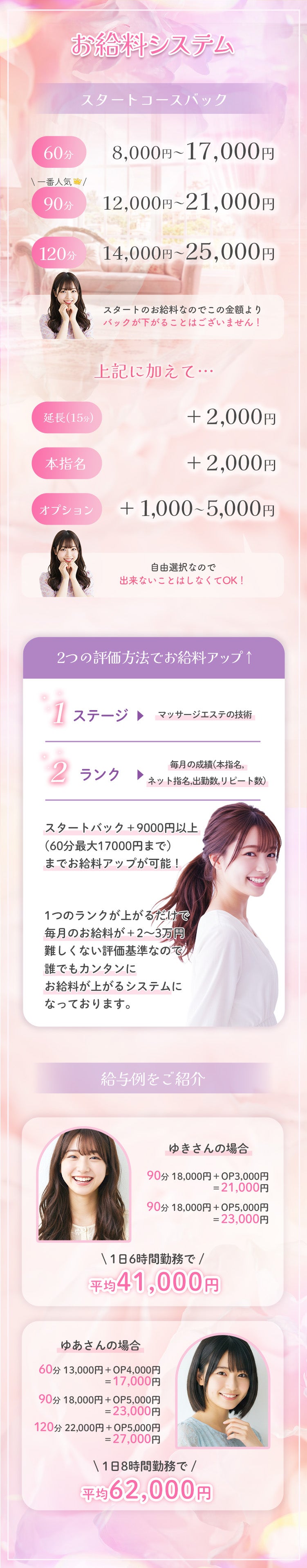 新人期間や短期集中で稼ぎたい方だけでなく、「なるべく長く高収入を稼ぎたい」という女性の頑張りが、きちんと報われる昇給システムとなっております。