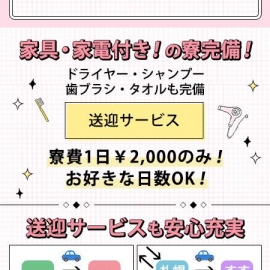 - ノルマ/罰金なし 自由出勤OK 個室待機可 生理中勤務可 寮あり 送迎あり アリバイ対策あり 性病対策あり 制服/衣装貸与 受け身なし 裸なし