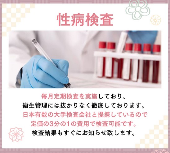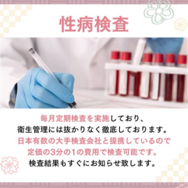 当店では女性キャストさんに毎月定期検査をお願いしています。日本有数の大手検査会社と提携していて、定価の3分の1に費用で検査可能です。衛生管理に手を抜いてはいませんのでご安心ください。