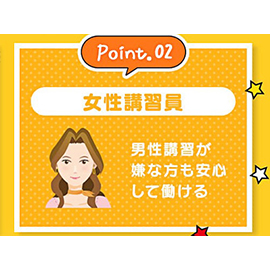 - 経験を積んだ女性講習員が在籍していますので、男性による実技講習はありません!