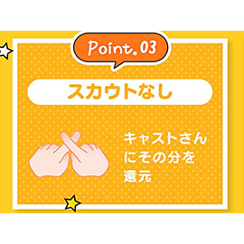 ・スカウトを一切使っていない為、各種諸経費を全てキャストさんのバックに還元しております