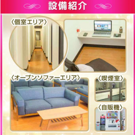 個室待機エリア、集団待機エリア(ソファスペース)、フリールーム、喫煙所があります。