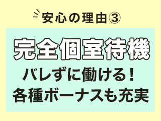 グループ共通の管理システムで、知り合いの来店を事前に察知し回避できます。また、完全個室待機なのでキャスト同士で会うこともありません。写真の掲載も、あなたの希望を最優先します。