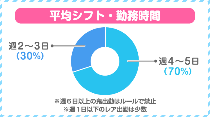 佐藤さん- 週4~5日の方が一番多いですね。当店では、週6日以上の連続出勤は認めていません。接客の質が低下するのを防ぐためです。そのため、いわゆる「鬼出勤」は自然と存在しないということになります。