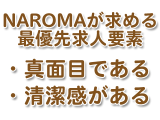 『昨今増加の一途を辿るエステ店の求人の中からNAROMAの求人をご覧頂きありがとうございます。当店はお客様もセラピストさんも、気軽にお越し頂けるよう努めております。高い料金には、もれなく高いハードルが付き物。何事もリーズナブルな価格と飽くなき企業努力で皆様に愛されるお店作りが出来ればと思っております。一緒に頑張って頂ければ嬉しいです。お会いできる事を心より願っております。』NAROMA店主