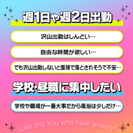 - ノルマ/罰金なし 自由出勤OK 個室待機可 生理中勤務可 寮あり 送迎あり アリバイ対策あり 性病対策あり 制服/衣装貸与 コスプレができる 女性運営スタッフ在籍 手だけ/見るだけ