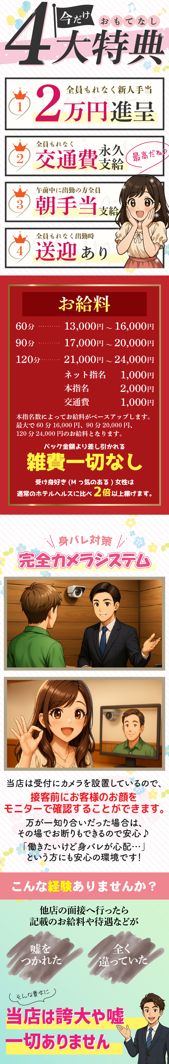 「ちょっとMっ気がある!」「私、受身派です!」な女性、高額バックのチャンスです!10年以上営業の人気老舗店だから集客力があり未経験でも初日から安心して稼げます!