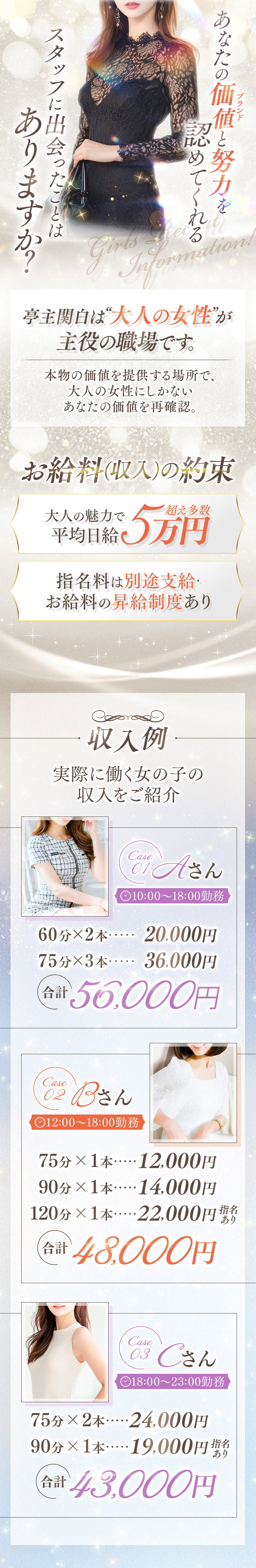 未経験でも安心♪落ち着いた大人の女性が活躍中の『亭主関白』。スタッフがあなたの価値と魅力を引き出します!