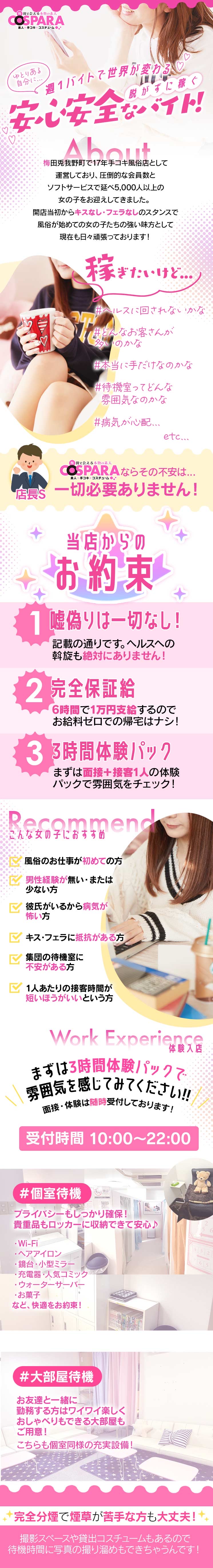 - 大手グループが指名数を言われたり、目出しを言われりするので、苦手なのと無駄にプロフィールページを見られて身バレも怖いので、単独店を探していた中でコスパラさんは良心的ないお店でした。書いてある通り、キスもフェラもなくて安心出来たし、保証があるので、容姿に自信のない私も不安なく働けました。オプションも1日で平均8000円くらいはあったので、悪い日でも2万5千円ほどあったので、内容的にもお給料的にも満足でした🎀