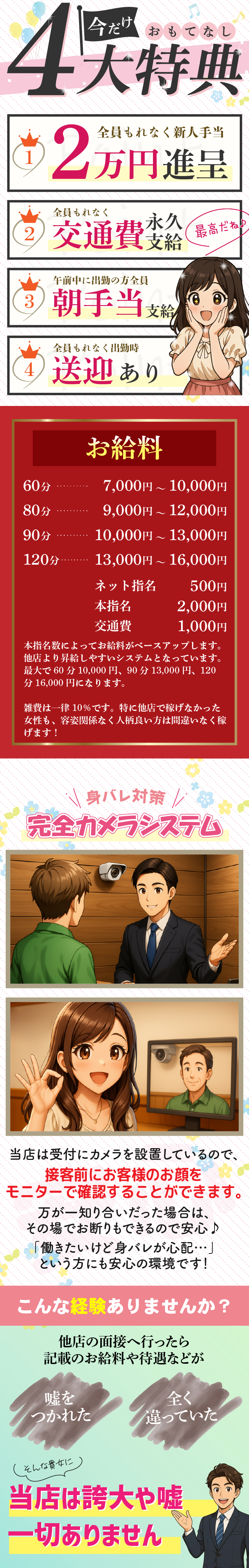 ご安心ください!当店は毎日面接、いつでも体験入店OK!お仕事したその日にお給料がもらえるので、毎日がお給料日です!未経験の方も初日から安心してしっかり稼げる体制となっています!