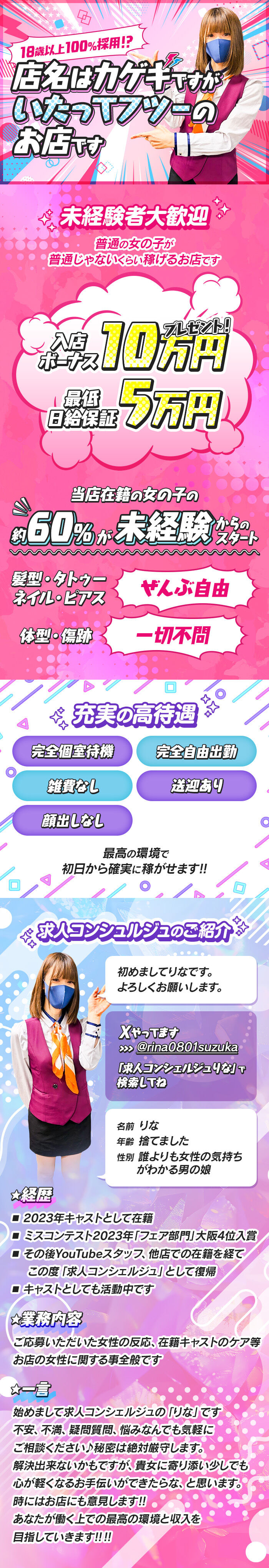 採用率100%!入店ボーナス10万円!最低日給保証5万円!店名はカゲキですが、いたってフツーのお店です♪