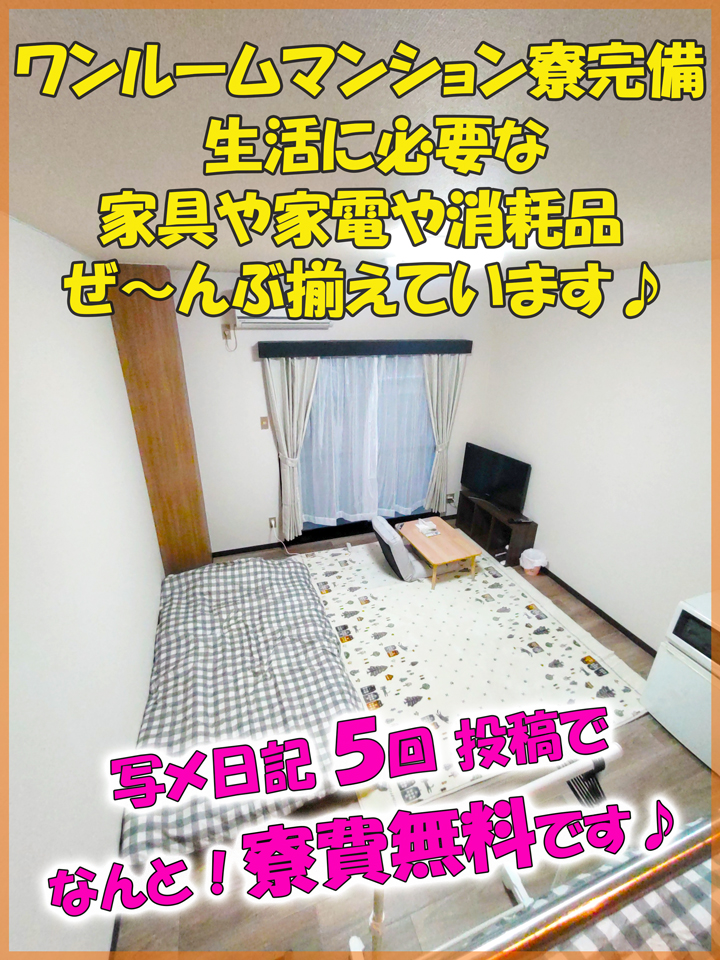 出稼ぎさん大歓迎!快適なワンルームマンション寮完備♪生活家具や家電、Wi-Fiまで全て揃っております!カバン一つで出稼ぎOK♪