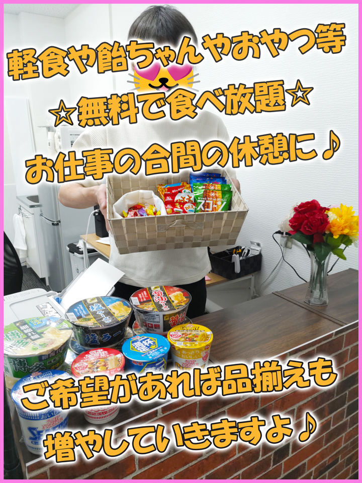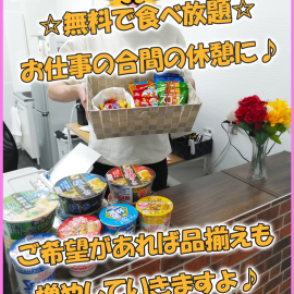 無料で軽い食事(カップ麺など)や飴などを置いてますので、小腹が減ったときはお気軽にご活用ください♪