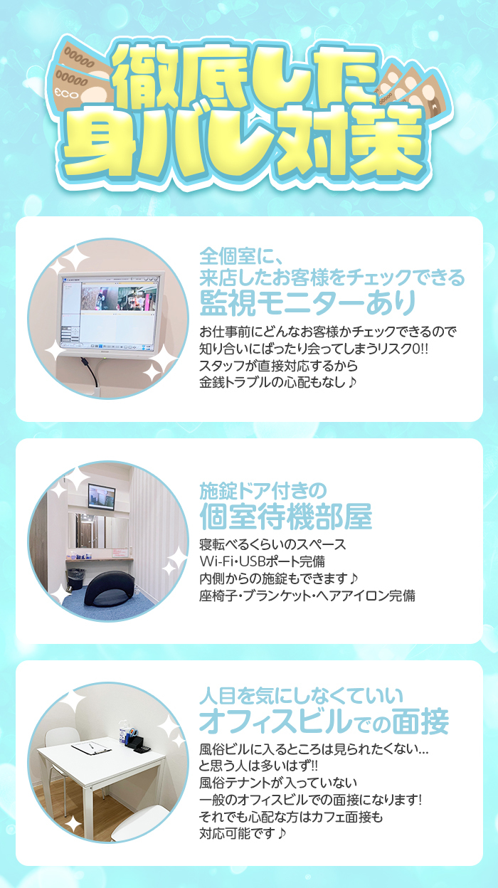 - お客様は良い方ばかり、しっかり稼げる、スタッフさんも親身になって相談に乗ってくれる、シフト自由、終電がない時間に働いても送迎がある、全て求人に載っていた通りだしなにも言うことなしのオール5だと思います!