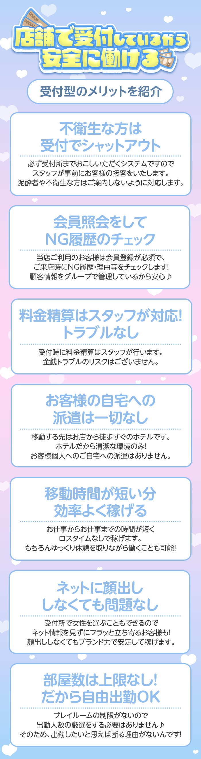 - 未経験って需要あるのかな?ないのかな?ってわからなかったんですけど、面接官の人に素人専門店コンセプトにしてるから大丈夫だよ!って言ってもらえて入店しました!こんなに稼げるならもっと早く始めればよかったです