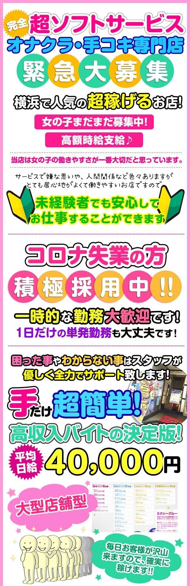 横浜・関内 大人気の有名店です!! 初心者・未経験の女の子のためのオナクラ店! 超ソフトサービスで簡単高収入!! 時給保証もありますので安心してお仕事ができます。