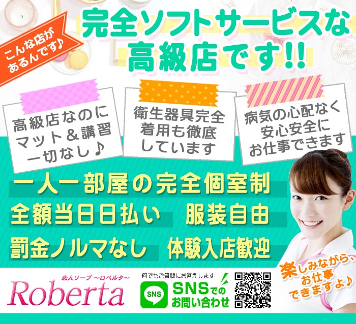 ソフトサービスの完全着用高級店!マット 講習なし 完全個室 体験入店可 初期費用 雑費0円 紳士的な優しいお客様ばかりです。ロベルタではスカウトや反社会勢力とのつながりは一切ありませんのでご安心ください!