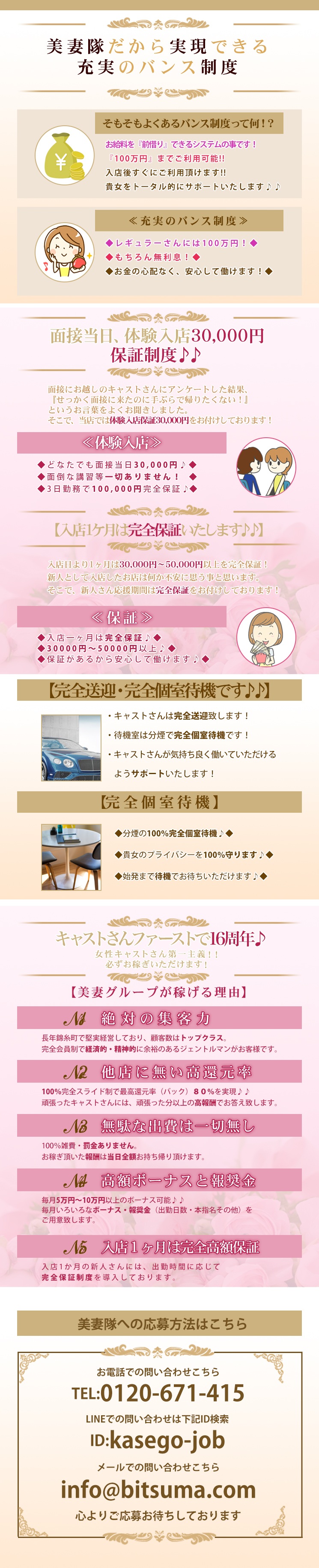 ★充実のバンス制度【大100枚までOK】 ◇◆さらに30,000円保証で手ぶらでお帰りいただくことはありません♪♪◆◇ ※本指名-報奨制度あり 法人経営の実績と集客広告の充実で、確実に稼いで頂けます。 ☆★未経験者の方でも即日高収入♪★☆ まずはお気軽にお問合わせください。 ご連絡お待ちしております♪♪ 錦糸町美妻隊 フリーダイヤル 0120671415 PC http://bitsuma-group.com/ LINE ID: kasego-job モバイル http://bitsuma-group.com/m