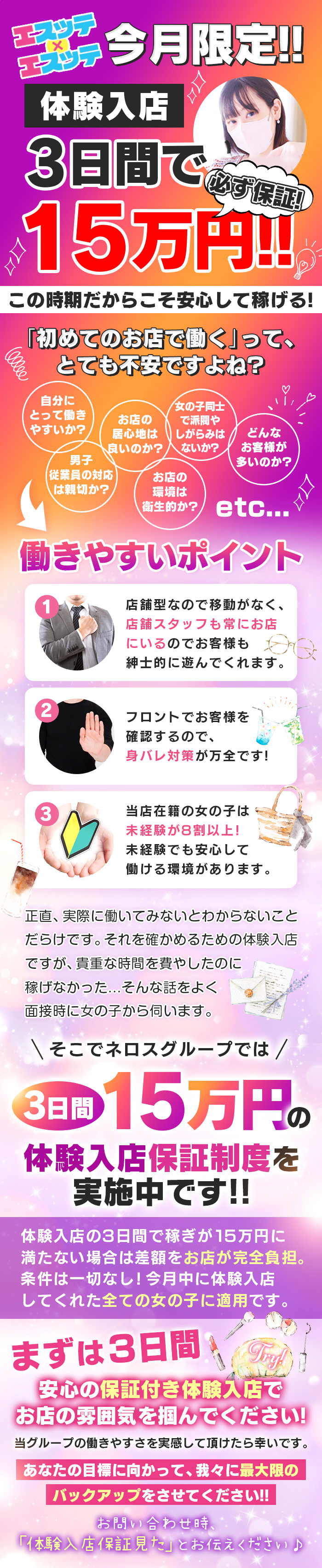 3日間で15万円の体験入店保証、大好評につき期間延長中!!