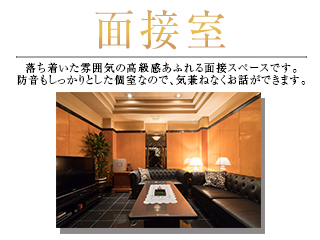 落ち着いた雰囲気の高級感あふれる面接スペースです。防音もしっかりした個室なので、気兼ねなくお話ができます。