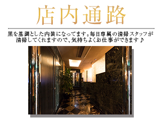 黒を基調とした内装になってます。毎日専属の清掃スタッフが清掃してくれますので、気持ちよくお仕事ができます