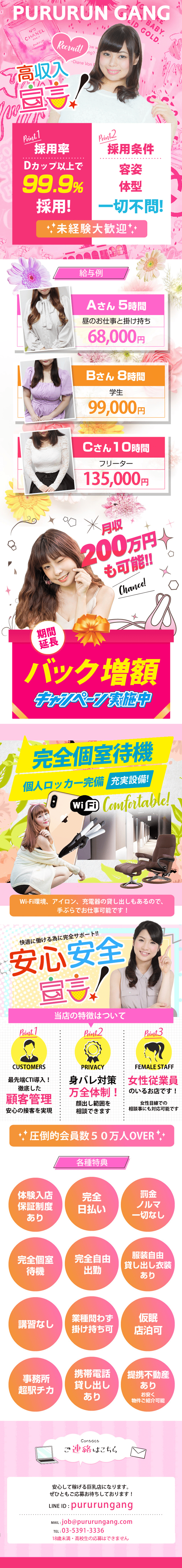正直働く時間によって異なりますが最低4時間勤務いただければ3万を切ることはありません 多少勤務時間をながくすればもちろん1日10万以上稼ぐ女の子もたくさんいます。 オープン以来約10年たくさんの常連様に通っていただいております 実績と信頼で誠実な運営を心がけ、 都内でもの高い集客力があり、時期や時間帯を問わず、安定して稼げるお店です。 新しい女の子はお店がバックアップしますので稼ぎは安心してください 。