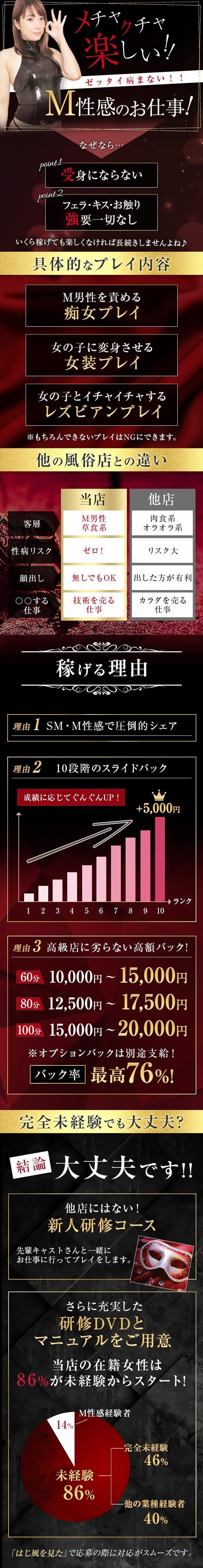 SM・ボンテージ・女装・レズ・フェティッシュ・官能小説のような世界感に興味がある方はぜひ当店で一緒に楽しく働いてみませんか?アングラ風俗にありがちなイメージを覆す、清潔で充実した環境のお店です!