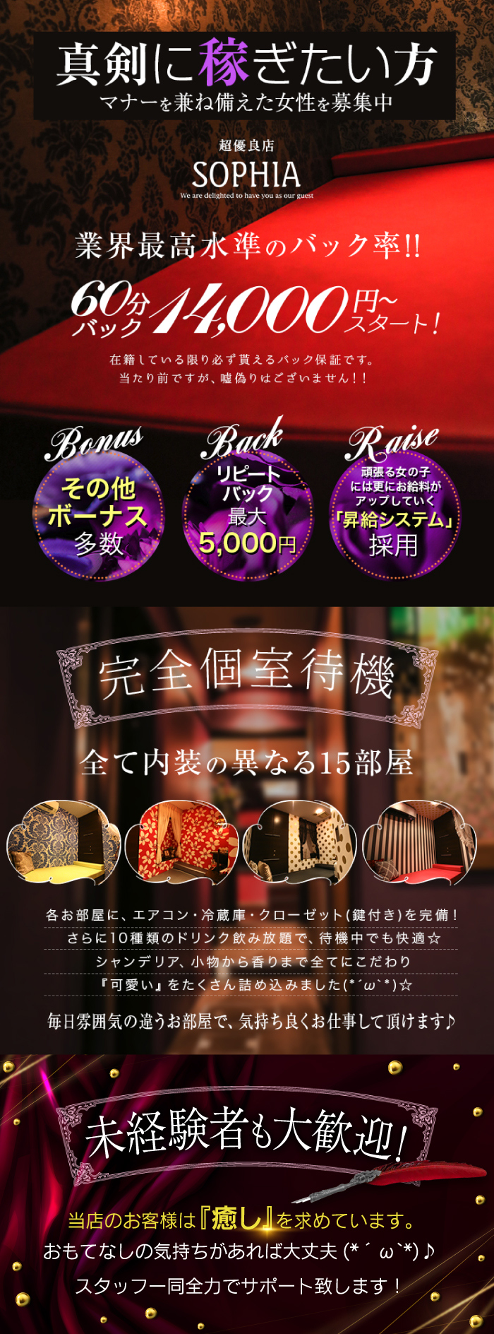 お客様は紳士的な方ばかりです。 SOPHIAでは、女の子を守る為の『ドレスコード』を設け、ルールを守って遊べないお客様のご利用を固くお断りしております。 万が一の事があっても、店舗型ですので、頼れるスタッフがすぐに駆けつけます! 未経験で入店してくれた女の子達にも、『客層がいい♪』『店舗型で良かった』と言って頂けております♪
