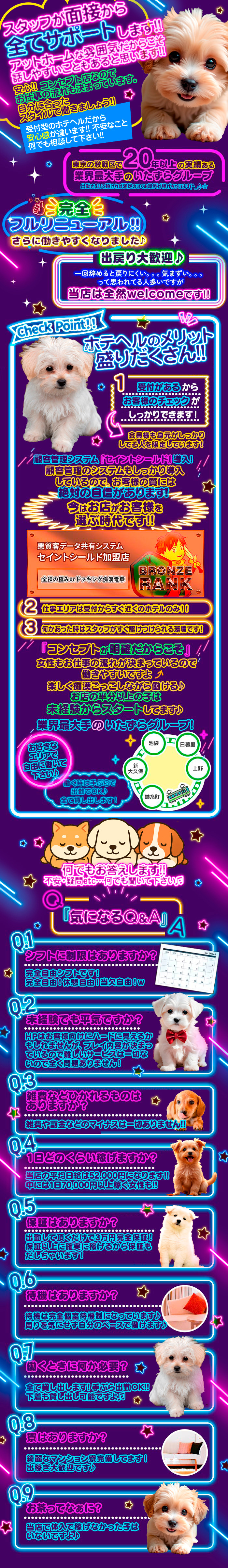 - ノルマ/罰金なし 自由出勤OK 個室待機可 自宅待機/勤務可 生理中勤務可 託児所紹介あり 寮あり アリバイ対策あり 性病対策あり 制服/衣装貸与