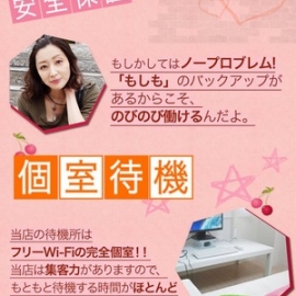 - 写メ日記強制なし ノルマ/罰金なし 自由出勤OK 個室待機可 自宅待機/勤務可 託児所紹介あり 寮あり 送迎あり アリバイ対策あり 性病対策あり 制服/衣装貸与 コスプレができる 女性運営スタッフ在籍
