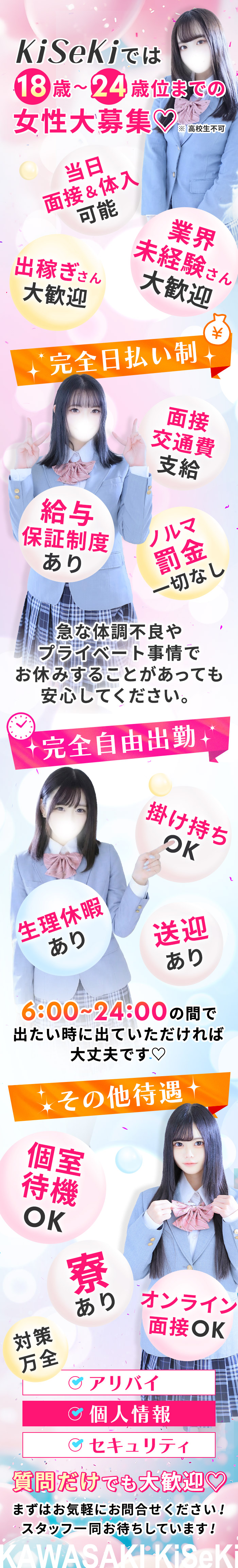 完全全額日払制、高額保障有り、アリバイ会社有り、マンション寮完備、個室待機可能、マット無し、嫌な講習一切なし、お店見学大歓迎・体験入店もOK、写真撮影代全額お店負担。