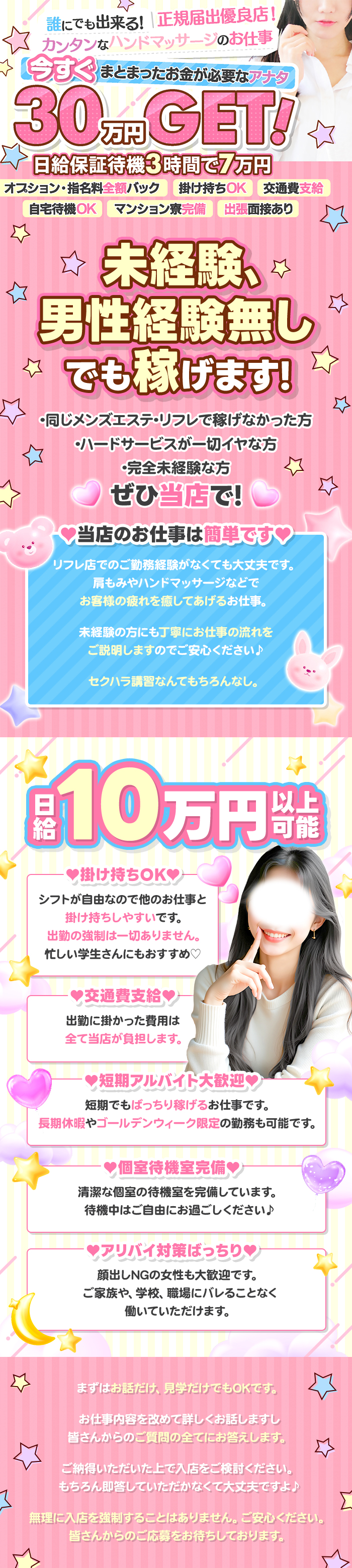 リフレでも日給▶10万円以上可能!体験入店で((30万円))稼げる!ボウズでも3時間待機でゼッタイに【7万円】保証!未経験でもめっちゃ高収入♡( *´艸`)