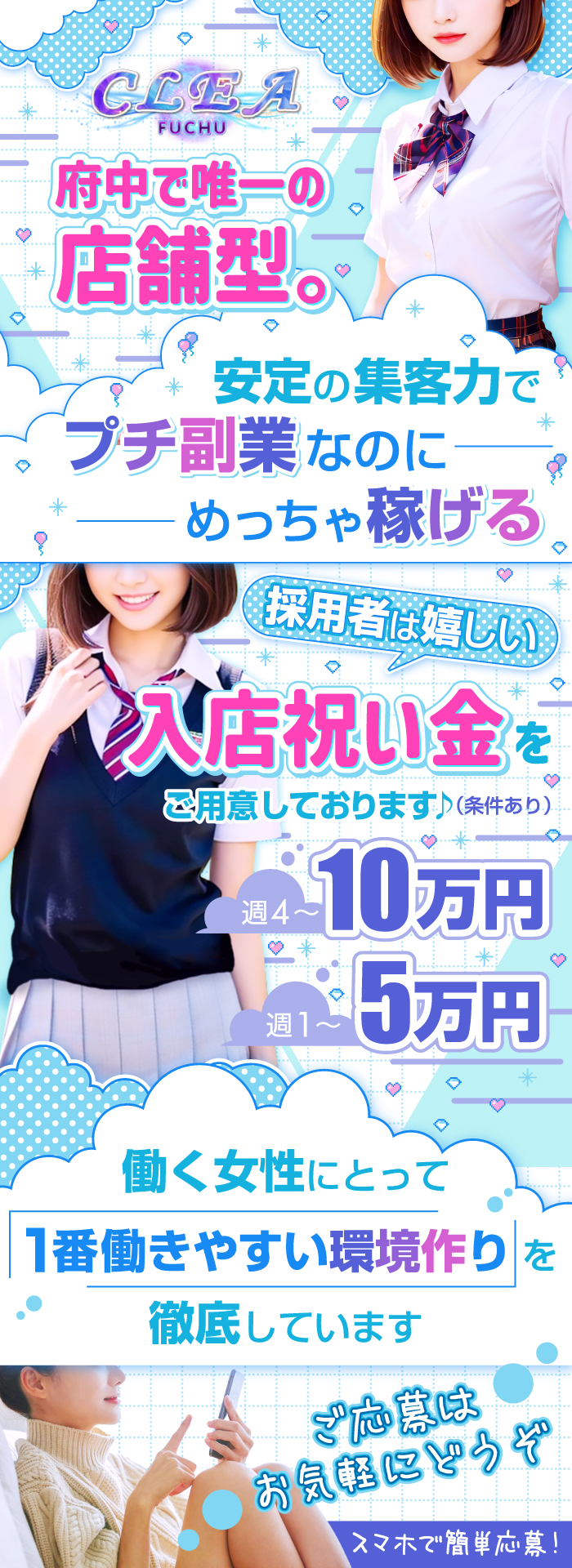 『CLEA(クレア)』は府中駅南口からすぐの場所にあるソフトサロンです。女の子のお仕事はフロアコンパニオン(キャスト)となります。