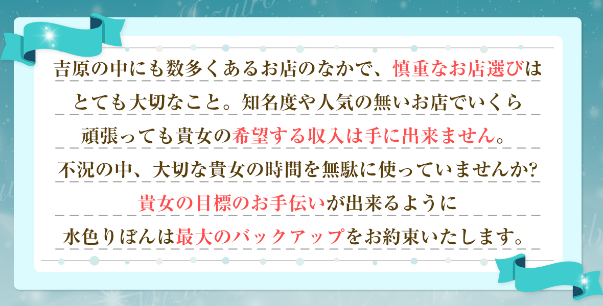 吉原にはたくさんお店があり迷いましたが、この業界ではじめて働くお店が水色りぼんで本当に良かったです!お店選びで迷っている方はぜひ!