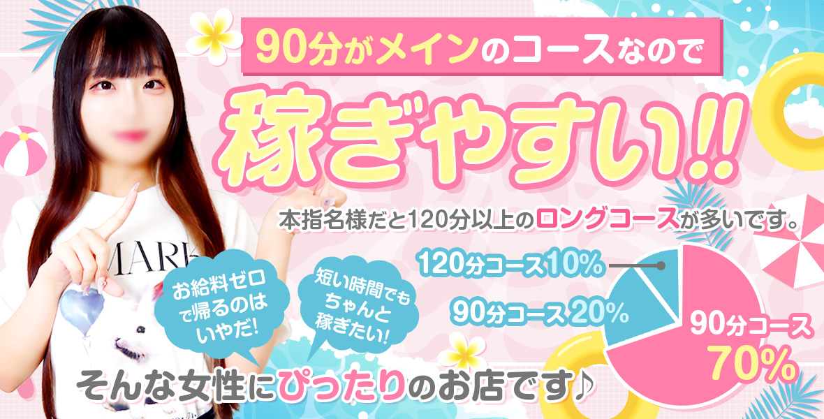 人気店なようで、待機もあまりなく回転のいいお店です。 90分以上の長いコースで遊ばれるお客様が多いので、そんなにせかせかしなくて良いです。 経験の少ない人が多いので、テクニックとかそんなに求められることもないので安心して働けます。