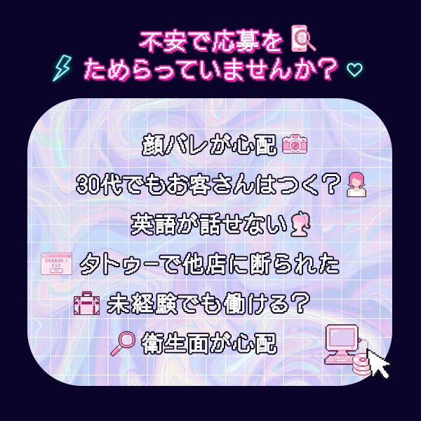 - 未経験者歓迎 タトゥー/傷跡OK 容姿不問 掛け持ちOK 短期歓迎 出稼ぎ歓迎