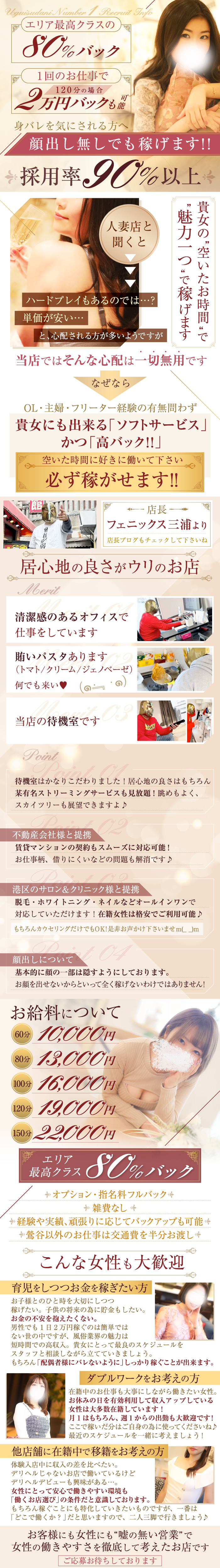 最初はエリアに抵抗があったのですが、働いてみてびっくり。超客層がいいです。私も他のエリアで勤務経験があるのですが、絶対鶯谷の方がいいです。お店の環境やスタッフさんには不満はないです。