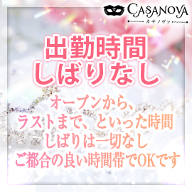 出勤時間のしばりは一切なし。オープンから・・ラストまで・・といった時間のしばりはありません。ご都合の良い時間帯で働けます