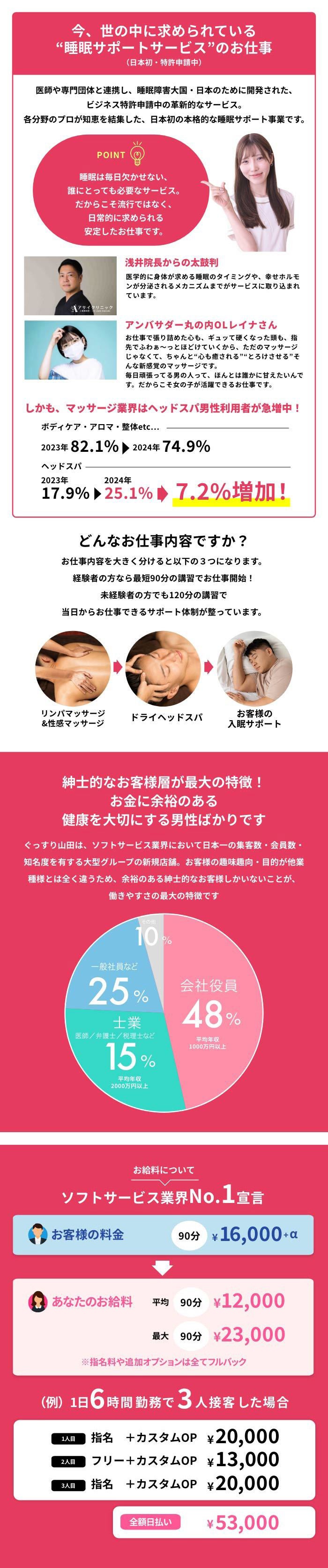 お仕事内容は大きく分けると【リンパ&性感マッサージ】【ドライヘッドスパ】【お客様の入眠サポート】の3つ!