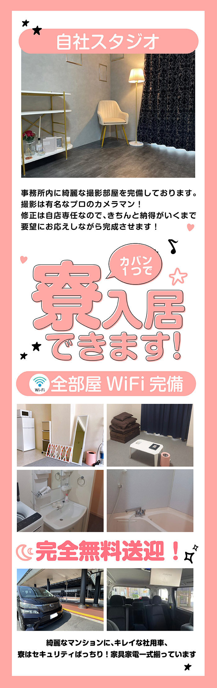 - 写メ日記強制なし ノルマ/罰金なし 自由出勤OK 個室待機可 自宅待機/勤務可 生理中勤務可 寮あり 送迎あり アリバイ対策あり 性病対策あり 女性運営スタッフ在籍