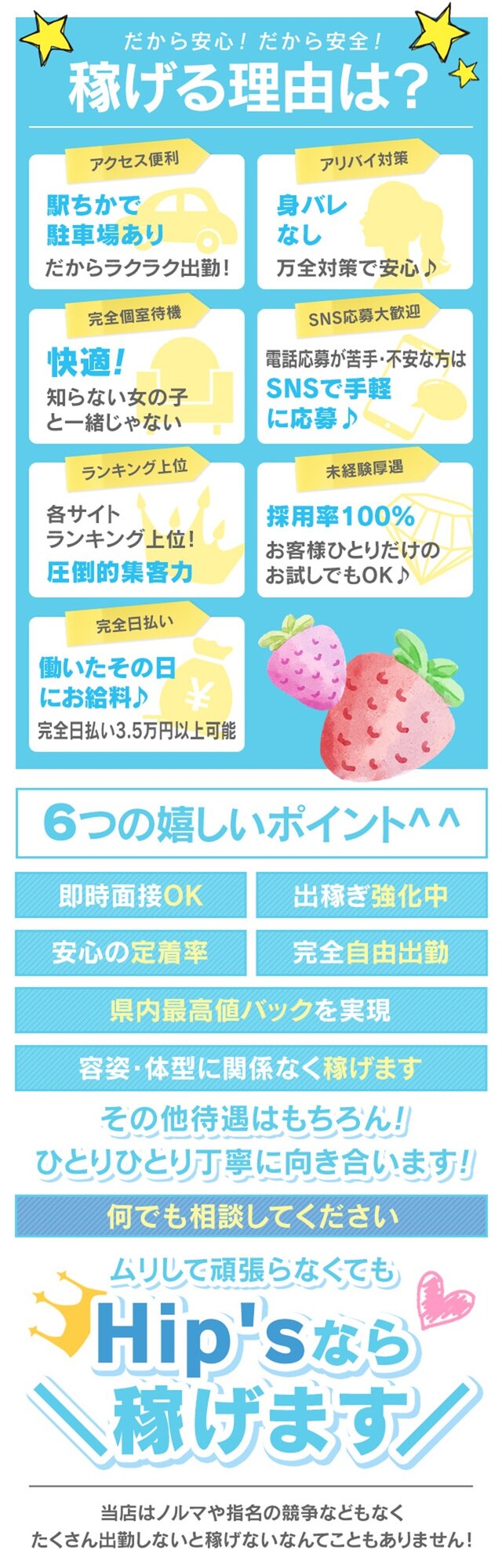 - ノルマ/罰金なし 自由出勤OK 個室待機可 自宅待機/勤務可 寮あり アリバイ対策あり 性病対策あり