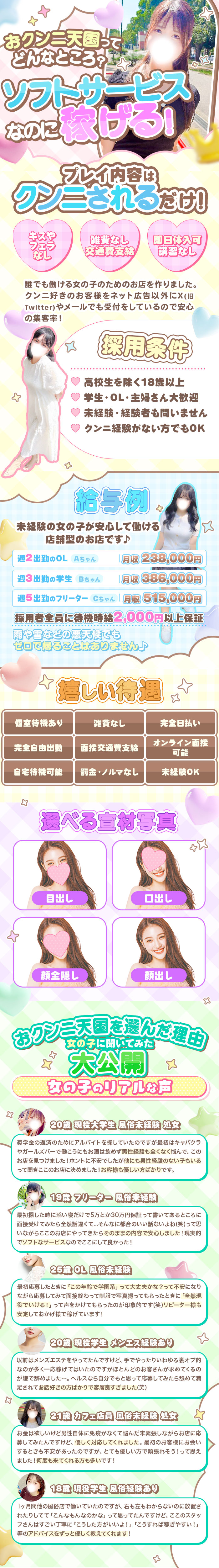 - ノルマ/罰金なし 自由出勤OK 個室待機可 生理中勤務可 託児所紹介あり 寮あり 送迎あり アリバイ対策あり 性病対策あり コスプレができる 女性運営スタッフ在籍 受け身なし 裸なし 手だけ/見るだけ