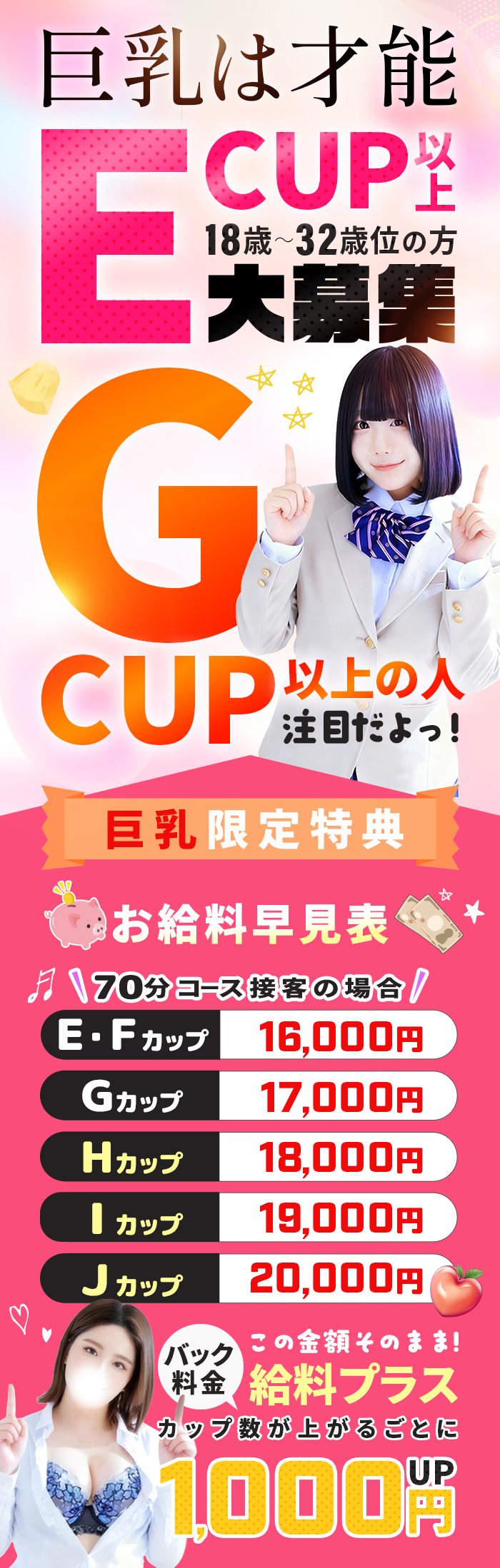 Eカップ以上(18歳~32歳)大募集!!巨乳専門・素人コンセプト店なので未経験でも大歓迎♥現在単価アップキャンペーン中!!