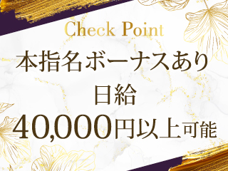 本指名ボーナスあり!日給40,000円以上可能です♪もちろんお給料は全額日払い!体験入店でもその日のうちにお持ち帰り頂けます♪