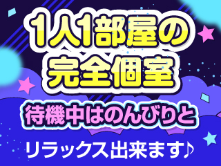 当店は完全個室待機を採用しています。他の女の子と顔を合わせることはほとんどありませんので、人間関係のストレスなく、お仕事に集中していただける環境です!